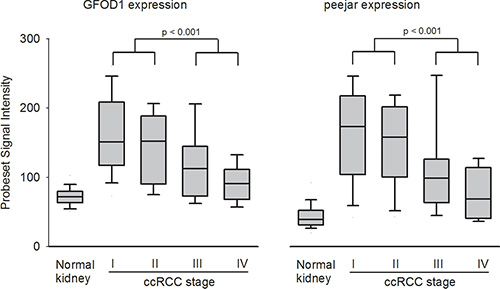 The gene expression of GFOD1 and peejar decreased with ccRCC tumor stage progression