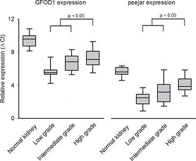 We further evaluated the gene expression of GFOD1 and peejar by qRT-PCR in an independent sample of 50 CCRCC tumor samples and 36 non-tumor kidney tissues. After reference genes normalization, the relative expression intensity (Ct) was highest in normal kidney tissue samples, and lowest in tumor samples with low grade G1. There were significant difference between gene expression in low or intermediate grade (G1 and G2) tumor tissue samples and high grade (G3 and G4) tumor tissue samples, which indirectly confirmed the observation that decrease of their gene expression linked to patient’s disease progression and poor prognosis (Figure 3).