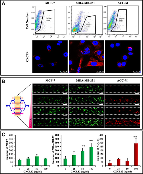 Figure 3: Chemokine-induced metastasis of CTCs in the microfluidic model. (A) CXCR4 expression on MCF-7, MDA-MB-231, and ACC-M cells detected by flow cytometry and immunofluorescent staining. CXCR4 (red) is expressed on the cell membrane, and DAPI (blue) indicates cell nuclei. Scale bar = 25 μm. (B) CXCL12-induced CTC metastasis in the microfluidic model. The concentrations of CXCL12 were 0 ng/mL, 25 ng/mL, 50 ng/mL, and 100 ng/mL from the upper to the lower chambers. MCF-7 cells (left) and MDA-MB-231 cells (middle) are labeled with CellTracker (green) (Life Technologies Corp., Gaithersburg, MD, USA), and ACC-M cells (right) are labeled with CellTracker (red) (Life Technologies Corp., Gaithersburg, MD, USA). Scale bar = 200 μm. (C) Quantification of adhesive cell numbers. The number of MDA-MB-231 cells increased significantly with 50 ng/mL and 100 ng/mL of CXCL12 (**p < 0.01, n = 8 per group). However, adhesion of ACC-M cells significantly increased only with 100 ng/mL CXCL12 (**p < 0.01, n = 8 per group).