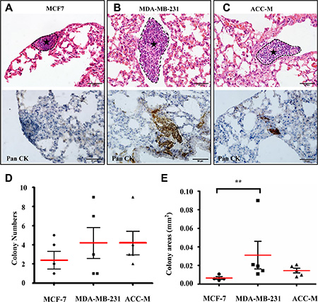 Figure 5: Physiological similarity of the microfluidic model to the animal model. (A–C) Typical metastatic colonies of MCF-7, MDA-MB-231, and ACC-M cells after HE staining and anti-human Pan CK immunostaining in the lung of nude mice. The metastatic colonies are circumscribed by black dotted lines and indicated by asterisk. Scale bar = 50 μm. (D) The metastasis rates and the colony numbers of MCF7, MDA-MB-231, and ACC-M, respectively. (E) The metastasic colony areas of MCF-7, MDA-MB-231, and ACC-M cells. The colony areas of MDA-MB-231 cells were significantly higher than those of MCF-7 cells (** p < 0.01, n = 5 per group).