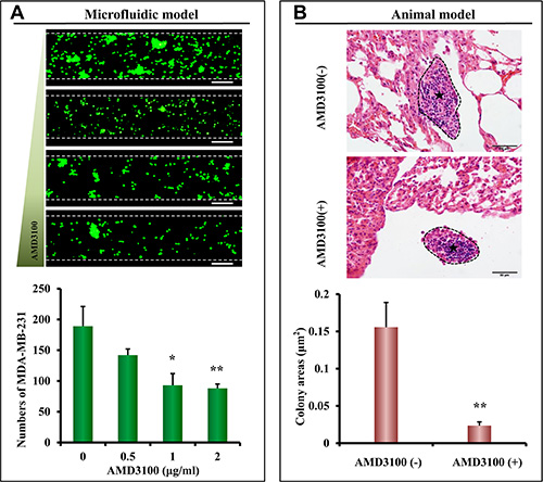 Figure 6: Inhibition of lung metastasis in the microfluidic model and nude mouse model. (A) Different concentrations of AMD3100 were used to inhibit the metastasis of MDA-MB-231 cells in the microfluidic device. Scale bar = 200 μm. Using the microfluidic model, quantitative analysis showed that 1 μg/mL and 2 μg/mL of AMD3100 significantly inhibited lung metastasis of MDA-MB-231 cells (*p < 0.05, **p < 0.01, n = 8 per group). (B) As assessed by colony areas, AMD3100 significantly inhibited lung metastasis of MDA-MB-231 cells in nude mice (**p < 0.05, n = 5 per group). The metastatic colonies are circumscribed by black dotted lines and indicated by asterisk.