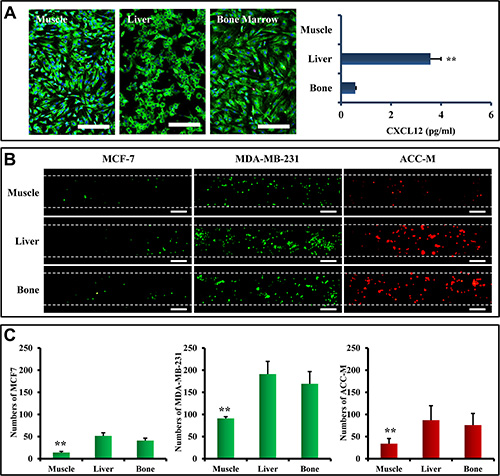 In addition to the lung, liver and bone marrow are common metastatic sites in both breast and salivary gland cancers [35, 36]. To demonstrate the potential of assessing multi-organ metastasis in the microfluidic model, primary cells isolated from liver and bone marrow were used to represent specific organs. Primary muscle cells were used as a control. These primary cells showed good viability of over 90% (Figure 7A). Quantitative analysis of CXCL12 expression by ELISA showed that CXCL12 was expressed in primary liver and bone marrow cells, but showed markedly low expression in primary muscle cells (Figure 7A). The three types of primary cells were seeded into the organ chambers of the microfluidic model, respectively, so that each chamber represented a specific organ. When MCF7, MDA-MB-231, and ACC-M cells flowed over the cell organ chambers, different numbers of tumor cells stopped and attached to HUVEC (Figure 7B). Statistical analysis showed that the numbers of arrested MCF7, MDA-MB-231, and ACC-M cells by liver, and bone marrow cells were significantly higher than those arrested by muscle cells (p < 0.01) (Figure 7C).