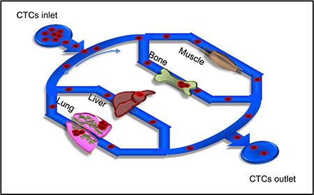 Figure 8: llustration of organ-specific metastasis of CTCs in the microfluidic chip. CTCs were pumped over multiple artificial organs, including lung, liver, bone, and muscle cells in the biomimetic model, followed by quantitation of organ-specific metastasis of CTCs.