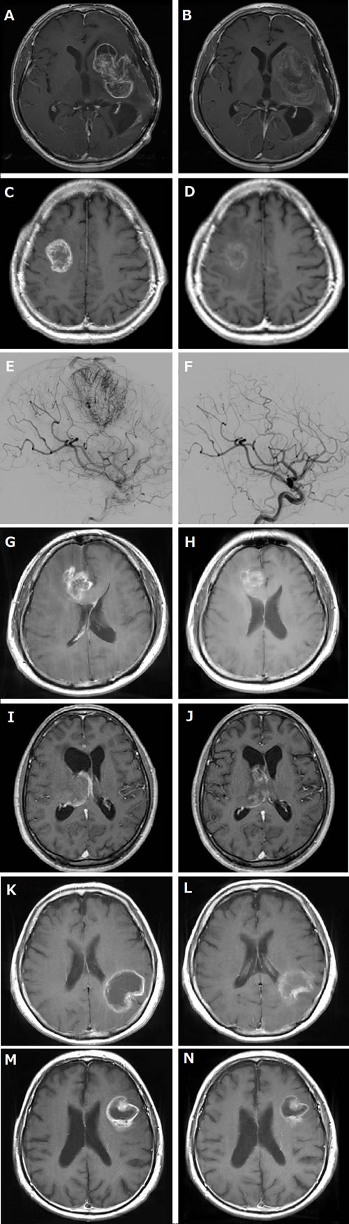Figure 1: MRI and angiography of before and after neoadjuvant bevacizumab (Bev). A-D, G-N,: T1-weighted images with contrast enhancement, E and F: cerebral angiography. A, C, E, G, I, K and M: before Bev treatment. B, D, F, H,J, L and N: after Bev treatment (before removal). A. and B. Showing decrease of contrast enhancement and disappearance of peritumoral edema by three courses of neoadjuvant Bev in case 1. Change in sum of the products of the greatest perpendicular diameter (SPD) was −8%. C. and D. Showing volume decrease and improvement of contrast enhancement of the right premotor tumor in case 2 by two courses of neoadjuvant Bev and one course of temozolomide. SPD change was −52%. E. and F. Note that the prominent tumor staining in case 2 was disappeared by two courses of neoadjuvant Bev and one course of temozolomide. G. and H. Showing volume decrease and marked improvement of contrast enhancement as well as peritumoral edema of the right frontal-corpus callosum tumor in case 3 by one course of neoadjuvant Bev. SPD change was −61%. I. and J. Showing mild tumor volume decrease and improvement of contrast enhancement as well as hydrocepharus in case 4 by one course of neoadjuvant Bev. SPD change was −23%. K. and L. Showing volume decrease and marked improvement of contrast enhancement as well as peritumoral edema of the left parietal lobe tumor in case 5 by one course of neoadjuvant Bev. SPD change was −14%. M. and N. Showing volume decrease and marked improvement of contrast enhancement as well as peritumoral edema of the left frontal lobe tumor in case 6 by one course of neoadjuvant Bev. SPD change was −43%.