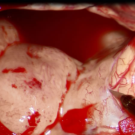 Figure 2: Intraoperative photograph during tumor removal in case 1 under neoadjuvant bevacizumab. Note that the tumor is shown as milky-whitish mass, suggesting hypovascularity.