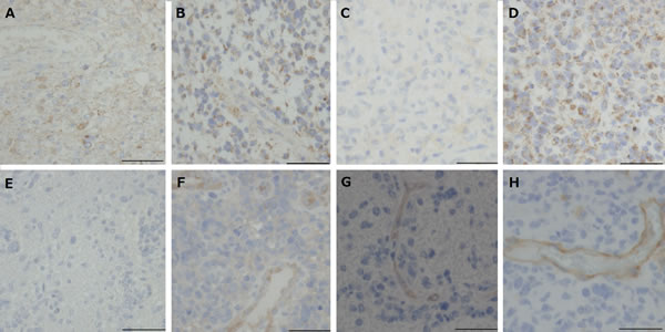 Figure 4: Immunohistochemical analysis for VEGF and VEGFRs in tumors resected under neoadjuvant bevacizumab (Bev) as compared with that in control glioblastomas. A. Before Bev treatment in case 1, shows diffuse staining for VEGF. (VEGF-A, original magnification ×400. The magnification bar: 50 μm). B. After Bev treatment in case 1, shows diffuse staining for VEGF (VEGF-A, original magnification ×400. The magnification bar: 50 μm). C. After Bev treatment in case 2. The tumor is negative for VEGF. (VEGF-A, original magnification ×400. The magnification bar: 50 μm). D. Control glioblastoma, showing diffuse staining for VEGF. (VEGF-A, original magnification ×400. The magnification bar: 50 μm). E. After Bev treatment in case 3. The expression of VEGFR1 is not observed either in vascular endothelial cells or tumor cells. (VEGFR1, original magnification ×400. The magnification bar: 50 μm). F. Control glioblastoma, showing staining for VEGFR1 in vascular endothelial cells. (VEGFR1, original magnification ×400. The magnification bar: 50 μm.). G. After Bev treatment in case 3, shows faint staining for VEGFR2 in vascular endothelial cells. (VEGFR2, original magnification ×400. The magnification bar: 50 μm). H. Control glioblastoma, showing strong staining for VEGFR2 in vascular endothelial cells. (VEGFR2, original magnification ×400. The magnification bar: 50 μm).