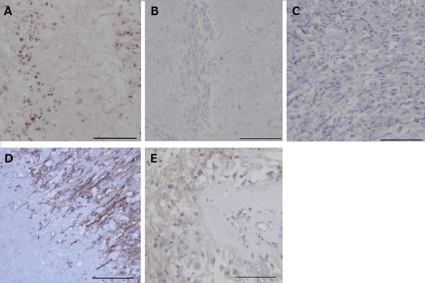Figure 5: Immunohistochemical analysis for HIF-1α and CA9 in the tumors resected under neoadjuvant bevacizumab (Bev) as compared with that in control glioblastomas. A. After Bev treatment in case 1, HIF-1α is expressed in many tumor cells predominantly around necrotic regions. (HIF-1α, original magnification ×200. The magnification bar: 100μm). B. After Bev treatment in case 3. The expression of HIF-1α is not observed. (HIF-1α, original magnification ×200. The magnification bar: 100 μm). C. After Bev treatment in case 4. The expression of HIF-1α is not observed. (HIF-1α, original magnification ×200. The magnification bar: 100 μm). D. Control glioblastoma showing strong membranous staining of CA9 in the perinecrotic tumor cells. (CA9, original magnification ×200. The magnification bar: 100 μm). E. After Bev treatment in case 2, CA9 is only weakly expressed in a few areas adjacent to large necrosis. (CA9, original magnification ×200. The magnification bar: 100 μm).