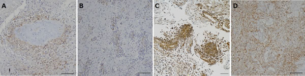 Figure 6: Immunohistochemical analysis for nestin in tumors resected under neoadjuvant bevacizumab (Bev) as compared with that in control glioblastomas. A. After Bev treatment in case 2. The expression of nestin is predominantly found in the tumor cells around a vessel (the vessel wall shows fibrous thickening and the vascular lumen is lined by nestin-positive endothelial cells). Nestin-positive cell ratio is 16.2%. (nestin, original magnification ×100. The magnification bar: 100 μm). B. After Bev treatment in case 3. Note that the majority of the nestin-positive cells are found around vessels. Nestin-positive cell ratio is 6.7%. (nestin, original magnification ×100. The magnification bar: 100 μm). C. After Bev treatment in case 6. Note that the expression of nestin is predominantly found around vessels. Nestin-positive cell ratio is 39.4%. (nestin, original magnification ×100. The magnification bar: 100 μm). D. Control glioblastoma showing diffuse strong staining in tumor cells and vascular endothelial cells. Nestin-positive cell ratio is 73%. (nestin, original magnification ×100. The magnification bar: 100 μm).