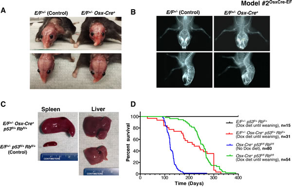 Figure 1: Postnatal expression of EWS-FLI1 in cells with the activated Osterix promoter in E/F+/- Osx-Cre+mice with or without p53 and pRb deletion in Model #2OsxCre-EF. A. Representative presentation of deformed nasal bone of an E/F+/- Osx-Cre+ mouse compared to an E/F+/- littermate control. B. X-ray imaging of an E/F+/- Osx-Cre+ mouse showing structural abnormalities in facial bones as compared to the clear facial bone structure of an E/F+/- littermate control. C. Representative photographs of spleens and livers collected from E/F+/- p53fl/+ pRbfl/+ (control) and E/F+/- Osx-Cre+ p53fl/+ pRbfl/+ littermates. Hepatomegaly and splenomegaly were consistently observed in E/F+/- Osx-Cre+ p53fl/+ pRbfl/+ mice displaying leukemia-like symptoms. D. Kaplan-Meier survival plots for the indicated genotypes: E/F+/- p53fl/+ pRbfl/+ (n = 15); E/F+/- Osx-Cre+ p53fl/+ pRbfl/+ (n = 31); and Osx-Cre+ p53fl/fl pRbfl/fl, (n = 54) mice with doxycline diet until weaning age. In addition, survival plot for Osx-Cre+ p53fl/fl pRbfl/fl (n = 80) mice with no doxycycline diet is presented.