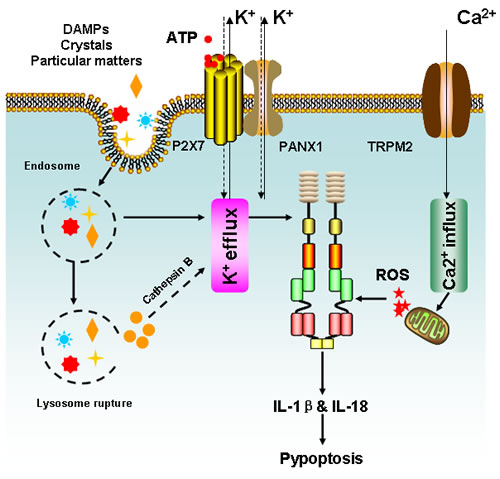 NLRP3 is the most well-studied member of NLR family. It can be activated by a wide range of signals including infected pathogens, endogenous or environmental origins [69]. Based on current findings, 3 distinct mechanisms have been proposed to account for NLRP3 activation, including potassium efflux, phagolysosomal destabilization and mitochondrial ROS burst. Various bacterial pathogens can secret pore-forming toxins (e.g., nigericin from Streptomyces hygroscopicus, listeriolysin O from Listeria monocytogenes, pneumolysin from Streptococcus pneumoniiae, alpha-hemolysin from Escherichia coli) and subsequently activate the NLRP3 inflammasome by increasing potassium efflux [70-76]. In addition, bacterial and viral RNA is also reported to be an initial factor contributing to NLRP3 inflammasome assembly [77]. Moreover, extracellular ATP released from phagocytosed dying cells acts on purinergic receptor, P2X7 and induces pannexin-1 (PANX1) channels to promote potassium efflux and results in NLRP3 activation [78-80]. On the other hand, intracellular uptake of crystalline and particulate matters is also capable of causing lysosomal destabilization and release of cathepsin B, a sensor of NLRP3 [81-85]. Lysosome rupture-induced NLRP3 activation was also observed in cathepsin B-deficient cells, a phenomenon that may be attributed to potassium efflux (Figure 4) [86].