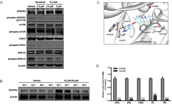 Figure 3: YLL545 functions via VEGFR2-dependent and independent pathways. A. HUVECs were treated with different concentrations of YLL545 and vehicle control for 72 h. The expression and phosphorylation of VEGFR2, mTOR, STAT3, and ERK1/2 were measured by immunoblotting and normalized to levels of β-actin. B. Cellular thermal shift assays were conducted using HUVECs treated with 50 μM YLL545 or vehicle control. The expression of VEGFR2 was measured by immunoblotting and normalized to levels of β-actin. C. Molecular docking showed the binding mode of YLL545 with the inactive conformation of VEGFR2. D. HUVECs were treated with 5 μM YLL545 or vehicle for 24 h. The expression of ITGAV, ENG, THBS1, FN1, and TEK expression were examined by quantitative PCR. Expression levels were normalized to GAPDH expression. ***P < 0.001 vs respective control in Student’s t-test.
