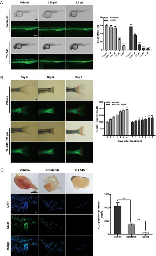 Figure 4: YLL545 inhibits angiogenesis in vivo. A. 12-hpf zebrafish embryos were incubated with different concentrations of YLL545 or sorafenib. At 36 hpf, fluorescent assays were performed to visualize the growth of ISVs and DLAVs, which were manually counted. **P < 0.01 and ***P < 0.001 vs respective control in Student’s t-test. Scale bars, 100 μm. B. At the indicated time points, fluorescent assays were performed to visualize the growth of caudal vessels, which were manually counted. *P < 0.05 and **P < 0.01 vs respective control in Student’s t-test. Scale bars, 300 μm. C. Matrigel containing 80 mg/kg YLL545 or 80 mg/kg sorafenib was subcutaneously injected into mice, and the plugs were surgically removed after 10 days. Expression of CD31 in plugs from YLL545- or sorafenib-treated mice was examined by immunofluorescent staining. Scale bars, 100 μm.