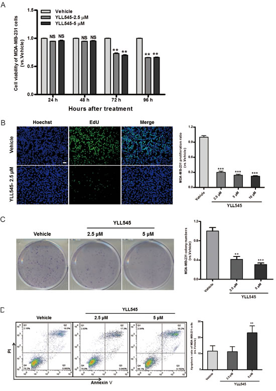 Figure 5: YLL545 inhibits tumor cell growth in vitro. A. Cell viability assays were conducted using MDA-MB-231 cells treated with different concentrations of YLL545. At the indicated time points, cell growth inhibition was determined. **P < 0.01 vs respective control in a one-way ANOVA followed by Tukey’s HSD test. B. Colony formation assays were conducted using MDA-MB-231 cells treated with different concentrations of YLL545 for 7 days. **P < 0.01 and ***P < 0.001 vs respective control in Student’s t-test. C. EdU proliferation assays were conducted using MDA-MB-231 cells treated with different concentrations of YLL545 for 72 h. ***P < 0.001 vs respective control in Student’s t-test. Scale bars, 50 μm. D. MDA-MB-231 cells were treated with different concentrations of YLL545 for 72 h, and annexin V/PI staining was analyzed using flow cytometry. The proportions of early apoptotic cells (annexin V-positive) and late apoptotic cells (PI-positive) are shown. **P < 0.01 vs respective control in Student’s t-test.