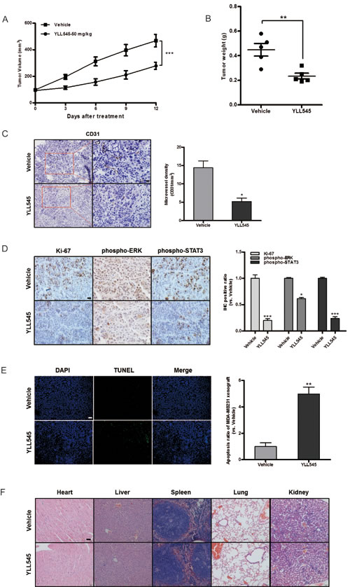 Figure 6: YLL545 exerts antitumor activities in vivo. A. and B. A total of 2.5×107 MDA-MB-231 cells were injected into the fat pad of nude mice (n = 5). Tumor development was monitored for 14 days. When tumors reached a volume of about 100 mm3, the mice were treated with 50 mg/kg/d YLL545 or vehicle for another 12 days. Cross-sectional diameters of tumors from YLL545- and vehicle-treated mice were measured. Approximate tumor volumes (A) and weights (B) were calculated as described in Materials and Methods. **P < 0.01 and ***P < 0.001 vs respective control in Student’s t-test. C. Expression of CD31 in breast cancer xenografts was examined by immunohistochemical staining. MVD was determined by CD31 staining. MVD was counted in five random fields in each tumor. *P < 0.05 vs respective control in Student’s t-test. Scale bars, 20 μm. D. Ki67, phospho-STAT3 and phospho-ERK1/2 levels in breast cancer xenografts were examined by immunohistochemical staining. *P < 0.05 and ***P < 0.001 vs respective control in Student’s t-test. Scale bars, 20 μm. E. YLL545-induced tumor cell apoptosis was measured by TUNEL staining in YLL545- and vehicle-treated mice. **P < 0.01 vs respective control in Student’s t-test. Scale bars, 100 μm. F. YLL545 did not cause obvious pathologic abnormalities in normal tissues. H&E staining of paraffin embedded sections was performed on heart, liver, spleen, lung, and kidney tissues from YLL545- and vehicle-treated mice. Scale bars, 50 μm.