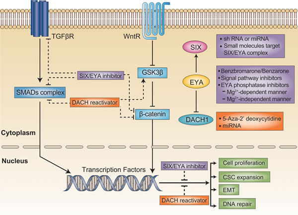 Figure 2: Targeting the DACH/SIX/EYA pathway in cancer treatment. TGFβ and Wnt signaling are both critical for tumor initiation and progression. Generally, SIX/EYA activates these two signaling pathways, whereas DACH1 negatively regulates them. The function of SIX could be blocked by the silencing of SIX expression with shRNA, or by the disruption of the SIX/EYA complex with small molecules. EYA phosphatase activity could be blocked by biochemical inhibitors. On the other hand, DACH1 expression could be reactivated with demethylating agents or miRNA. Thus, targeting RDGN members is a promising therapeutic strategy that could restrain malignant behavior in tumors.