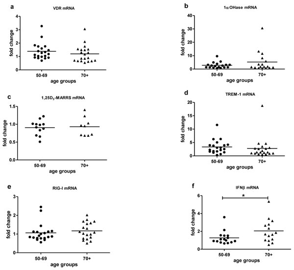 Figure 2: Baseline mRNA expression by age. VDR a., 1α-OHase b., 1,25D3-MARRS c., TREM-1 d., RIG-I e., IFN-β f. mRNA expression by age group was measured in untreated PBMCs and compared to expression in a calibrator sample (untreated random PBMCs).Gene expression was assessed by RT-qPCR.All assays were done in duplicate and expression was normalized to β-actin.The relative amount of target gene in each sample was estimated using the 2-ΔΔCT method as described elsewhere [49]. The mean of the values is represented by the horizontal line. Statistical analysis was performed by Student’s test (* p <0.05).