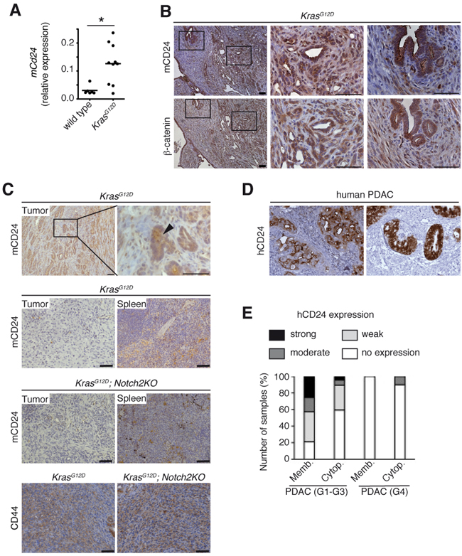 Figure 1: h/mCD24 is expressed in differentiated PDAC. A. Cd24 mRNA expression increased in KrasG12D mice compared to wild type at the age of 6 months. B. Immunohistological staining for mCD24 and β-catenin in murine differentiated PDAC. C. Immunohistological staining of murine differentiated and undifferentiated PDAC of indicated genotypes. Spleens from the same mice were used as a positive control for staining. D. Immunohistological staining for hCD24 in human PDAC. Examples showing membranous, cytoplasmic or both staining patterns. E. A series of human ductal (G1-G3) and undifferentiated (G4) pancreatic cancers was stained for hCD24. The membrane-bound and cytoplasmic stainings were scored according to a three-tiered system (1 - <10%, 2 - 11-50%, 3 - >50% of the cells are positive). Scale bars = 50 μM.