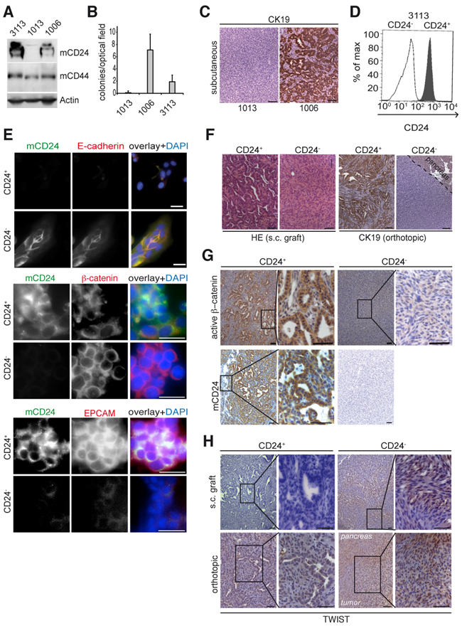 Figure 2: mCD24 expressing tumor cells lead to differentiated tumors. Pancreatic cells were either mCD24 negative (#1006) or mCD24 positive (#1006 and #3113). A. Western blot analysis of primary mouse cell lines. B. Soft agar assay. Mean ± SD. C. immunohistological analysis of s.c. tumors generated from CD24− or CD24+ pancreatic cells. D, E. Pancreatic cells (#3113) were sorted into CD24− and CD24+ cell populations. D, purity of sorted populations was confirmed by FACS analysis using a mCD24-FITC antibody. E, immunofluorescence staining of sorted cells. F. Left panels: histology of tumors (N=13) generated by s.c. injections of CD24− and CD24+ pancreatic cells. Right panels: immunohistological analysis for CK19 expression of tumors generated by orthotopic transplantation of CD24− and CD24+ pancreatic cells. G, H. Immunohistological analysis of s.c. and orthotopic tumors, as described in F, showing strong cytoplasmic expression of active β-catenin in CD24+ tumors and nuclear TWIST expression in CD24- tumors. Scale bars = 50 μm.