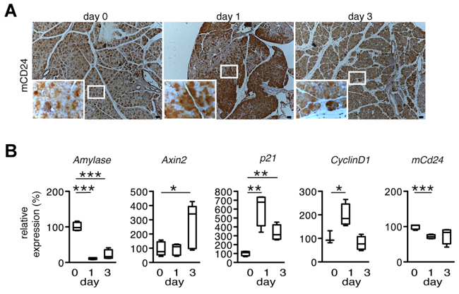 Figure 3: mCD24 expression in a mouse model for acute pancreatitis. A. Murine pancreatic tissue of an experimental model for cerulein induced acute pancreatitis was analyzed by immunohistochemistry at the indicated time points. mCD24 expression was strongly upregulated at day 1. Scale bars = 50 μm. B. Pancreatic tissue from the same mice as in A was lysed and relative expression of the indicated genes was analyzed by real-time qRT-PCR.