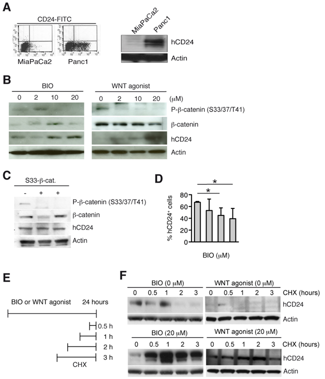 Figure 4: Activation of canonical WNT pathway increases hCD24 expression by stabilization of CD24 protein. A. FACS analysis of surface (left panel) and total (right panel) hCD24 expression in human PDAC cell lines. B. Panc1 cells were stimulated with BIO or WNT agonist for 24 hours. Western blot analysis shows a decrease in β-catenin phosphorylation indicating successful activation of the WNT pathway in concomitance with an increase in hCD24 expression. C. Panc1 cells were transiently transfected with an expression vector containing active β-catenin (S33-β-catenin). hCD24 expression was not affected. D. FACS analysis for hCD24 surface expression in Panc1 cells after stimulation with BIO. Mean ± SD. E. Panc1 cells were treated with BIO or WNT agonist for 24 hours and cycloheximide (CHX) was added before harvesting the cells at the indicated time points. F. Panc1 cells were treated as described in D: Western blot analysis shows increased hCD24 expression.