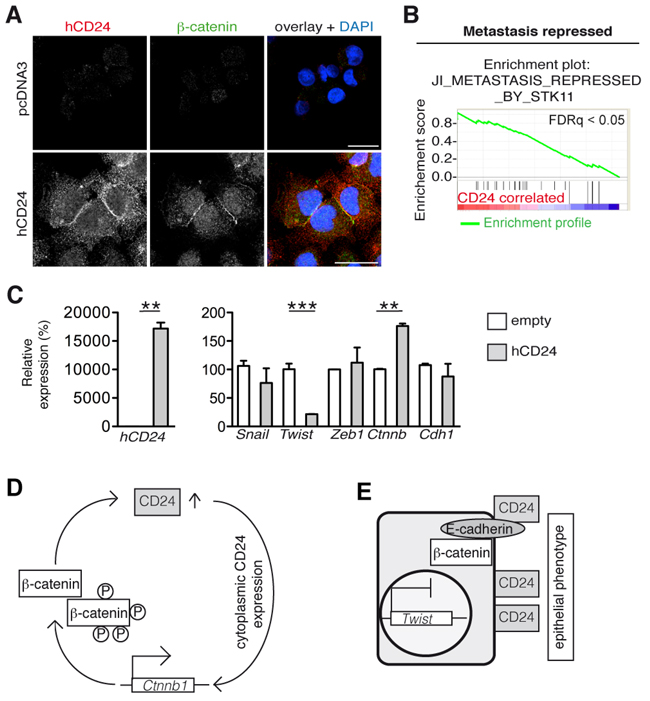 We further investigated the mechanism involved in hCD24 expression and regulation of the epithelial phenotype. The PDAC cancer cell line MiaPaCa2 harbors mesenchymal features and hardly expressed hCD24 compared to Panc1 cells, which have a more ductal phenotype (Figure 4A and Supplementary Figure S6D). We transiently transfected MiaPaCa2 cells with a hCD24 expression plasmid (Figure 5A). hCD24 expressing cells acquired expressed membranous β-catenin (Figure 5A). Next, we performed microarray-based transcriptional profiling of transfected MiaPaCa2 cells using gene set enrichment analysis (GSEA). CD24 overexpression correlated with repression of genes involved in metastasis (Figure 5B) that is linked to EMT. When we analyzed single genes involved in MET regulation by real time qRT-PCR, we found that the mesenchymal transcription factor Twist was downregulated while the epithelial marker Ctnnb was upregulated in concomitance with hCd24 overexpression (Figure 5C). Thus hCD24 is a regulator of epithelial-mesenchymal transition phenotypes.