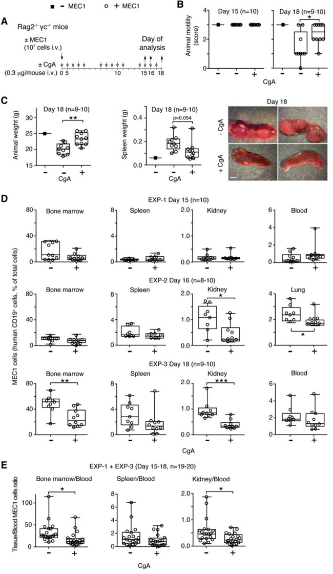 Figure 3: Effect of low-dose CgA on disease progression and organ infiltration by leukemic cells in the MEC1 xenograft model. A. Schematic representation of the experiment. Rag2-/-γc-/- mice were injected, i.v., without (■) or with (○) 107 MEC1 and sacrificed at day 15, 16 or 18, in three independent experiments (EXP-1, -2 and -3). Mice were treated, i.v., with 0.3 μg of CgA (+) or with vehicle (-) at the indicated time (8-10 mice/group). B. Animal motility at day 15 and 18, before killing: score 0, impaired motility with a severe inability to reach food and water; score 1, inability to remain upright with hunched abnormal posture; score 2, less vital and curious behavior; score 3, animals showing a normal behavior. C. Animal and spleen weights at the indicated time. Photographs of representative spleens at day 18 of mice treated with or without CgA are also shown. D. Quantification of MEC1 cells (CD19+) in bone marrow, spleen, kidney, lung, and blood at day 15, 16 and 18 (three separate experiments). Cell suspension obtained from different organs were stained with phycoerytrin-cyanine 7-labelled anti-human CD19 antibody and analysed by FACS. E. Tissue/blood ratio of MEC1 cells in different organs is shown. (B-E) Box-plots with median, interquartile and 5-95 percentile values; *, P < 0.05; **, P < 0.01; ***, P < 0.001 (t test, two-tailed).