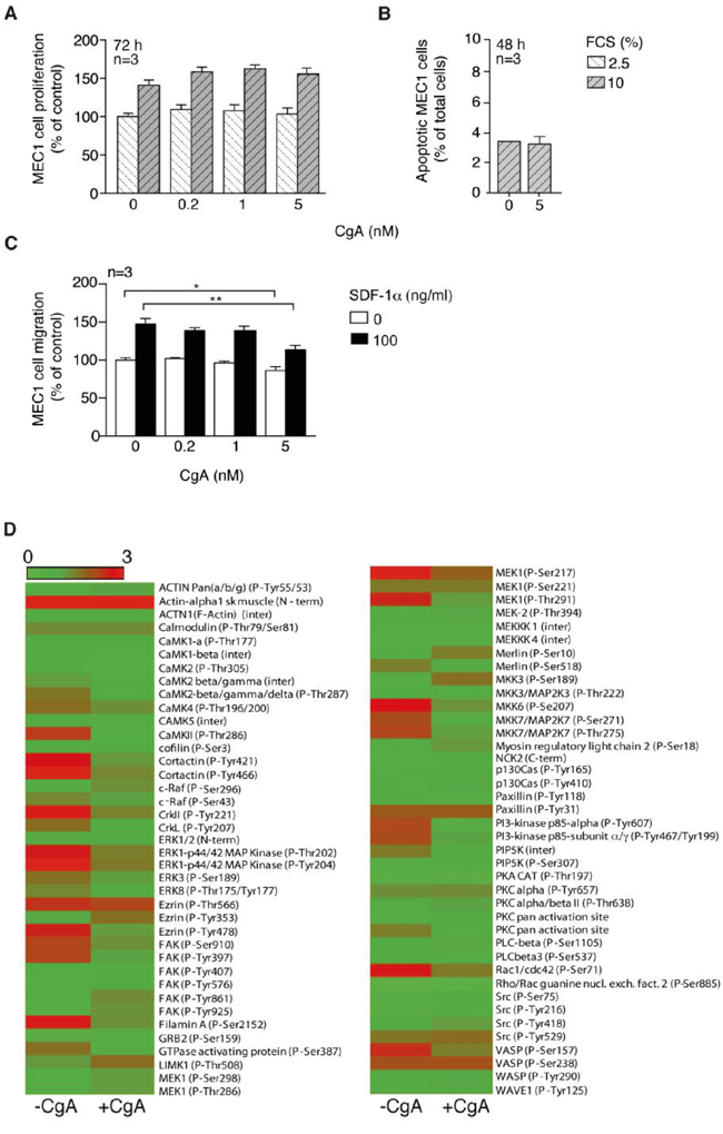 Figure 4: Effect of CgA on MEC1 cell proliferation, viability, migration and cytoskeleton activation. A. Effect of different concentrations of CgA and FCS on MEC1 cell proliferation (72 h incubation). Bars, mean ± SEM. B. Effect of different amounts of CgA on MEC1 cell viability (48 h incubation). Bars, mean ± SEM. C. Effect of CgA on the migration of MEC1 cells through trans-well system microporous filters. The upper and lower chambers of trans-well systems, pre-coated with HUVECs, were filled with different amounts of CgA and 0 or 100 ng/ml SDF-1α, respectively. Cells migrated to the lower side of the filter after 4 h of incubation, were counted by FACS (see Supplemental Methods). Bars, mean ± SEM; *, p<0.05; **, p<0.01 by two tailed t test. D. Effect of CgA (5 nM) on protein phosphorylation in MEC1 cells. After treatment, cells were lysed and analyzed with cytoskeleton II Phospho Array (full Moon Byosystems). Visualization of the microarray data was obtained using matrix2png (1.2.1) program (Pavlidis, 2003).