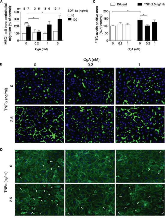 Figure 5: Effect of CgA on MEC1 cell trans-endothelial migration and on endothelial cell permeability. A. Effect of CgA on the migration of MEC1 cells through endothelial monolayers cultured in trans-well systems. The upper and lower chambers of trans-well systems, pre-coated with HUVECs, were filled with different amounts of CgA and 0 or 100 ng/ml SDF-1α, respectively. Cells migrated to the lower side of the filter after 4 h of incubation, were counted by FACS (see Supplemental Methods). Bars, mean ± SEM of the indicated number of independent experiments (n) each in quadruplicate (*, P < 0.05; ***, P < 0.001 by two tailed t test). B. Effect of CgA on TNFα-induced endothelial cell permeability. The assay was performed as described in Supplemental Methods. The binding of FITC-avidin to coverslips coated with biotinylated gelatin and with confluent HUVEC cell monolayers (pre-treated for 4 h with the indicated doses of CgA and TNFα) is shown. Nuclei were stained with 4’,6-diamidino-2-phenylindole (DAPI, blue). Images were taken using 20× objectives. Green fluorescence corresponds to the leaky areas of the endothelial monolayers. C. Quantification of FITC-avidin flux through the endothelial monolayers after treatment with CgA and TNFα (see Supplemental Methods). Three independent experiments were performed (2 slides/condition, 5 fields/slide for each experiment). Bars, mean ± SEM (*, p<0.05 by two tailed t test). D. Effect of CgA on F-actin assembly and gap formation (arrows) induced by TNFα in confluent HUVEC. F-actin fibers were stained with FITC-phalloidin (green); nuclei were stained with DAPI (blue). Images were taken using a 20× objective.