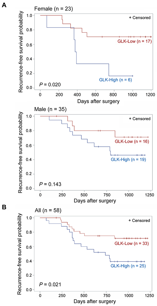 In addition, using the Kaplan-Meier survival analysis, NSCLC patients with GLK overexpression showed poor recurrence-free survival in females (n = 23, GLK-High versus GLK-Low, P = 0.020) but not in males (n = 35, GLK-High versus GLK-Low, P = 0.143). Nonetheless, poor recurrence-free survival was still shown in all GLK-overexpressed NSCLC patients (n = 58, GLK-High versus GLK-Low, P = 0.021; Figure 2). As expected, the pathologic stage was also correlated with recurrence-free survival (stage I+II versus stage III, P = 0.043; Supplementary Figure S5A). According to the tumor types, the reduced time periods of recurrence-free survival were observed in adenocarcinoma patients with GLK-High (n = 38, GLK-High versus GLK-Low, P = 0.035) but not in squamous cell carcinoma patients with GLK-High (n = 20, GLK-High versus GLK-Low, P = 0.245; Supplementary Figure S5B). Thus, NSCLC patients with GLK overexpression have a worse prognosis than the patients without GLK overexpression, especially in adenocarcinoma.