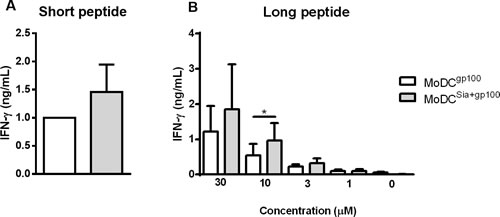 Figure 7: Sialidase treatment of human MoDCs improves antigen cross-presentation via MHC-I to CD8+ T cells. Gp100-specific CD8+ T cells were co-cultured overnight with gp100-loaded MoDCs, that have been previously treated or not with sialidase (MoDCsia+gp100 and MoDCgp100, respectively). To evaluate the activation of CD8+ T cells, the secretion of IFN-γ cytokine was measured by ELISA. A. Short gp100 peptides or B. different concentrations of the long gp100 peptide were used to load MoDCs. Graph values are normalized to the condition of MoDCgp100 with the short peptide. Data refers to the IFN-γ secretion (ng/mL) (average ± SEM) of 3 independent experiments. Statistical significance (*P < 0.05) refers to the difference between fully sialylated and desialylated gp100-loaded MoDCs.
