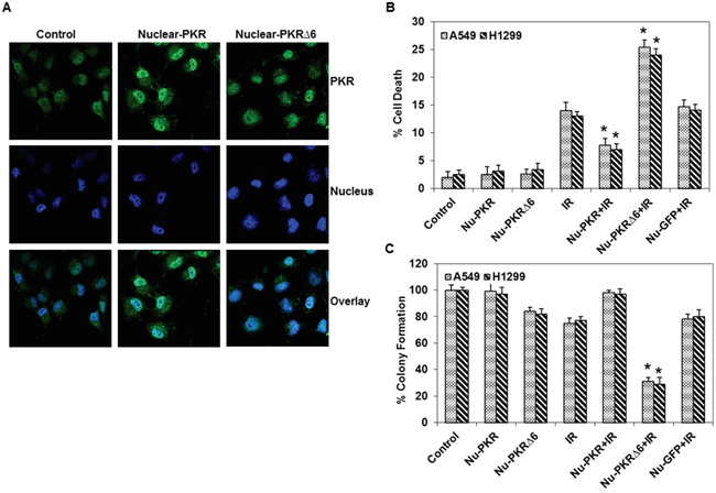 Figure 3: Expression and subcellular localization of PKR in nuclear-targeted wild-type PKR and mutant PKRΔ6-transduced lung cancer cells. A. Immunofluorescence microscopy with antibodies against PKR (green) and the nucleus (blue=DAPI staining for DNA in the nucleus) demonstrated accumulation of PKR in the nuclei of A549 lung cancer cells after treatment with nuclear-targeted wild-type PKR and mutant PKRΔ6 after 48 hrs. B. Flow cytometric analysis of apoptosis in nuclear-targeted GFP and wild-type or mutant PKR-transfected H1299 and A549 lung cancer cells, with or without radiation treatment. Triplicate experiments were performed for each cell line (top). C. Clonogenic survival assay of A549 and H1299 lung cancer cells treated with nuclear-targeted plasmids (5 μg) and radiation (10 Gy). Treatment with nuclear-targeted mutant PKRΔ6 sensitized A549 and H1299 cancer cells to radiation therapy. *, p < 0.05 by Wilcoxon rank-sum test compared with corresponding control (IR, IR+Ad-PKR or IR+Ad-Luc) group.