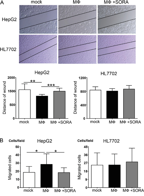 Figure 4: Polarized macrophages pretreated with sorafenib inhibit cellular migration of HepG2 cells. A. SubconfluentHepG2 and HL7702 cells were scratched with a plastic pipette tip and incubatedwith the supernatant of polarized macrophages (MФ) that were stimulated under the following conditions: mock, DMSO; MФ, DMSO + LPS; MФ + SORA, sorafenib (1.2 μg/mL) + LPS. The results of this wound healing assay were photographed and measured. B. HepG2 and HL7702 cells transmigrate toward sorafenib-treated polarized macrophage cultures. *P < 0.05, **P < 0.01, and ***P < 0.001 for the indicated comparisons.
