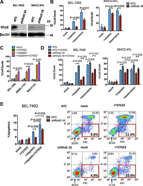 Figure 1: ROCK activity regulated chemoresistance in HCC cells. (A) Western blot showing RhoE protein levels in both non-target control and shRhoE-16 infected HCC cells. (B, C and D) Quantification of percentage of cell death induced by (B) 48-hour treatment of cisplatin and doxorubicin in non-target control (NTC) and RhoE knockdown cells, (C) 48-hour treatment of i) mock, ii) cisplatin, iii) Y27632, and iv) cisplatin and Y27632. (D) 48-hour treatment of cisplatin and doxorubicin with or without Y27632 in NTC and RhoE knockdown cells. (E) Annexin V flow cytometry assessment of the apoptotic cell population after 24 hours of cisplatin treatment with or without Y27632. Cells undergoing apoptosis are represented by the Annexin V+ve/PI−ve populations (red rectangles). In all panels, 3 experiments are represented. P-value was calculated using Student’s t test. 20 ug/ml cisplatin and 10 μM Y27632 were used.