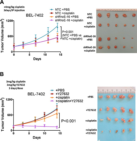 Figure 3: Rho/ROCK activity modulates HCC chemoresistance in vivo. (A and B) Xenograft tumor growth derived from subcutaneously injected HCC cells in nude mice. Tumors were first allowed to grow to about 100 mm3 in size and then different treatments were given to the mice as described below. (A) RhoE knockdown BEL-7402 cells and NTC were used. Mice were given either 4 mg/kg cisplatin or PBS through intraperitoneal injection once every 3 days. Cisplatin only slowed down the growth of NTC tumors but not that of RhoE knockdown tumors. (B) Parental BEL-7402 cells were used. Mice were given i) PBS, ii) 4 mg/kg Y27632, iii) 3 mg/kg cisplatin, and iv) 3 mg/kg cisplatin + 4 mg/kg Y27632, respectively, through intraperitoneal injection once every 3 days. Combined treatment of cisplatin and Y27632 had synergistic effect in suppressing HCC tumor growth than cisplatin alone. Representative result from 3 experiments is shown. P-value was calculated using non-linear regression.
