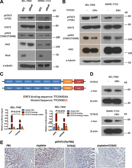 Figure 4: Inhibition of ROCK repressed the activity of JAK2 and STAT3. (A) Knockdown of RhoE by siRNA induced phosphorylation of both JAK2 and STAT3 in BEL-7402 and SMMC-7721 cells. (B) Treatment with Y27632 for 24 hours inhibited the phosphorylation of JAK2 and STAT3 in BEL-7402 and SMMC-7721 cells. (C) Schematic diagram showing the construct which expressed firefly luciferase under the control of STAT3-binding elements. Both Y27632 and ROCK2 knockdown by siRNA reduced the luciferase activity in BEL-7402 cells. SV40-driven expression of Renilla luciferase was used as normalization control. (D) Treatment with Y27632 for 24 hours decreased the protein level of c-myc, a transcriptional target of STAT3, in BEL-7402 and SMMC-7721 cells. (E) Representative IHC staining of p-STAT3 (Y705) in xenograft tumors harvested from subcutaneous tumor injection model (Figure 3B). Y27632 remarkably diminished the p-STAT3 (Y705) signals; the p-STAT3 stain was nearly totally abolished in the combined Y27632 and cisplatin treatment group. Original magnification, ×20; scale bars: 200 μm. 10 μM Y27632 was used. In all panels, 3 experiments are represented. P-value was calculated using Student’s t test.