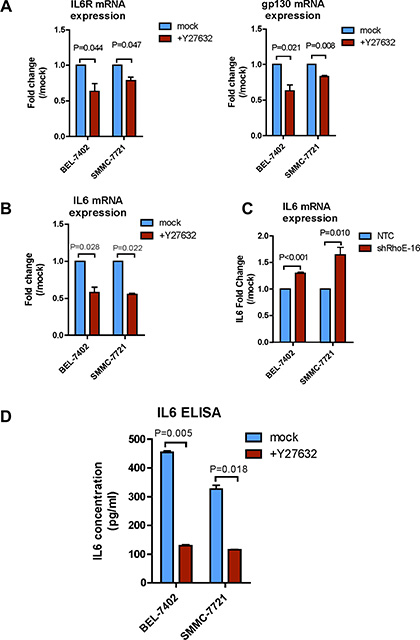 Figure 5: Rho/ROCK signaling regulates expressions of IL-6 receptor and IL-6. (A and B) Real-time qPCR was used to measure the mRNA levels of (A) IL-6R and gp130, and (B) IL-6 in mock and Y7632-treated BEL-7402 and SMMC-7721 cells. Y27632-treated cells had reduced mRNA expression of IL-6R, gp130 and IL-6. (C) Knockdown of RhoE significantly augmented the mRNA expression of IL-6 in BEL-7402 and SMMC-7721 cells as compared to the corresponding NTCs. (D) ELISA assay was used to assess IL-6 secretion to the cultured medium by BEL-7402 and SMMC-7721 cells. Inhibition of ROCK by 24-hour treatment of Y27632 markedly repressed IL-6 secretion. 10 μM Y27632 was used. In all panels, 3 experiments are represented. P-value was calculated using Student’s t test.