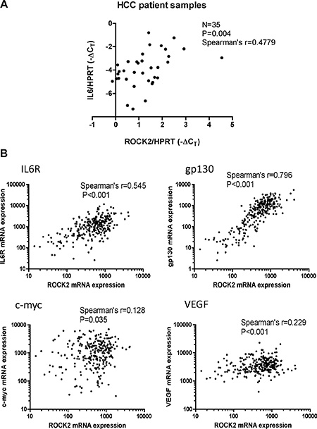 Figure 7: Clinical correlation of ROCK2 and activation of NF-κB and IL-6 signaling in HCC. (A) The mRNA levels of ROCK2 and IL-6 in clinical HCC samples (n = 35) were measured by qPCR. HPRT was used as the endogenous control. ROCK2 expression was found to positively correlate with IL-6 expression with Spearman’s r = 0.4779 (B) The mRNA expression levels of ROCK2 positively correlated with those of IL6R, gp130, c-myc and VEGF by Spearman’s rank correlation in HCC patients’ data from TCGA.
