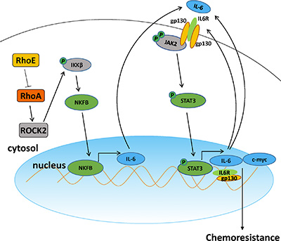 We had previously demonstrated that ROCK2 was overexpressed and RhoE, an antagonist of the Rho/ROCK signaling, was underexpressed in HCC and together they promote HCC metastasis [13, 14]. In this study, we identified that these two events resulted in hyper-activation of ROCK2, which in turn activated an IKKβ/NF-κB/IL-6/STAT3 positive feedback loop and conferred chemoresistance to HCC cells. Our work also led to the finding of ROCK inhibitor as a potential therapeutic agent for both chemo-sensitization and suppression of metastasis in HCC.