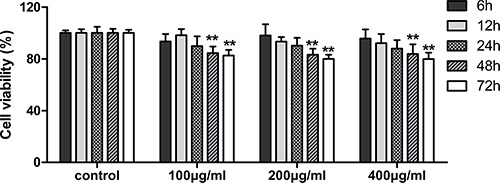Figure 1: Effects of fucoidan on viability of HLECs. Cell viability was detected in each group after 48 and 72 h in culture. Values are the mean ± SD from three independent experiments. **p < 0.01 versus the untreated control (two-way ANOVA).
