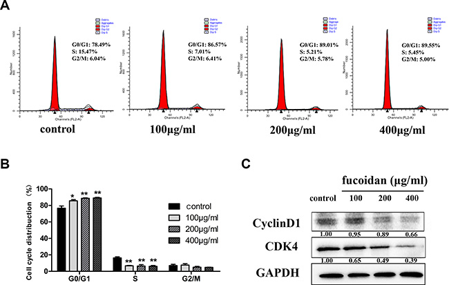 Figure 2: Effect of fucoidan on the cell cycle distribution in HLECs. (A) Flow cytometry histograms and (B) cell cycle distributions for the G0/G1, S and G2/M phases assessed via flow cytometry, showing the G0/G1 phase was blocked by fucoidan after 48 h, inducing a decrease of cells in the S phase. (C) Effect of fucoidan on the protein expression levels of CDK4 and cyclin D1. Values are mean ± SD. *p < 0.05 and **p < 0.01 versus the untreated control (two-way ANOVA).