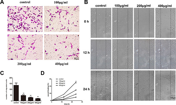 The anti-migration effect of fucoidan on HLECs was assessed using a Transwell migration assay and a wound scratch assay. Transwell was adopted to assay the chemotactic motility of HLECs. Cells (5 × 104 cells/well) were plated on the upper Transwell chamber (6.5 mm diameter inserts; 8.0 μm pore size) and treated with different concentrations of fucoidan (0–400 μg/ml) in serum-free medium, while the inside lower chamber contained fresh medium in the absence of fucoidan. After 24 h in culture, cells were fixed with 70% ethanol and stained with 10% crystal violet in order to count the migrated cells at the undersurface of the filter. At least five visual fields were counted for each group to obtain an average.