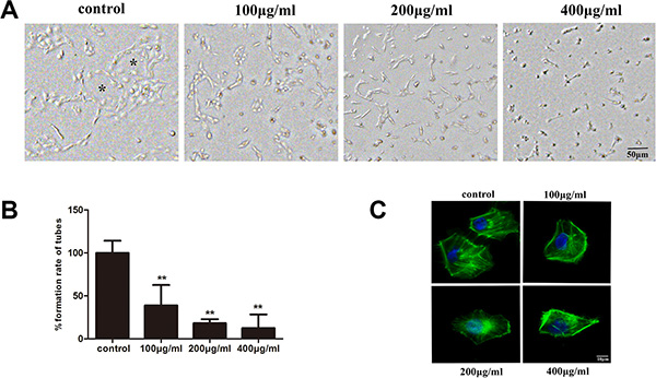 Figure 4: Fucoidan inhibits lymphatic tube formation in HLECs on matrigel and regulates cytoskeleton polarization of HLECs. HLECs were incubated for 24 h in medium with or without fucoidan (0, 100, 200 and 400 μg/ml). (A) Photomicrographs of tube formation in HLECs (scale bar is 50 μm). The symbols (*) on the figure represents complete tubular structures. (B) Quantitative analysis of the rate from the number of tubes. Data represented as mean ± SD; **p < 0.01 versus the untreated control (one-way ANOVA). (C) Cells were incubated in medium with or without fucoidan (0, 100, 200 and 400 μg/ml) for 24 h. Cells were stained with phalloidin (green) and DAPI (blue), and observed (magnification, ×100).