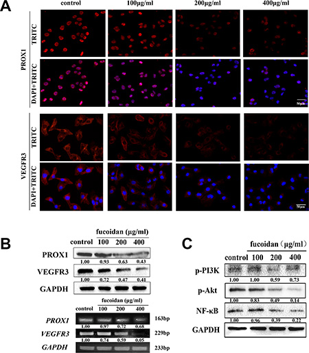 Figure 5: Fucoidan downregulates the expression levels of VEGFR-3 and PROX1 and VEGFR3-related signaling pathways. (A) Microscopy images (scale bar is 50 μm) showing the immunofluorescence staining, which was performed with TRITC-labeled anti-VEGFR3 and anti-PROX1 (red) and DAPI (blue). (B) The protein expression levels of PROX1 and VEGFR3 were measured by western blot analysis; The transcription levels of PROX1 and VEGFR3 measured by RT-PCR. (C) Protein levels of p-PI3K, p-Akt and NF-κB in fucoidan-treated or control groups.