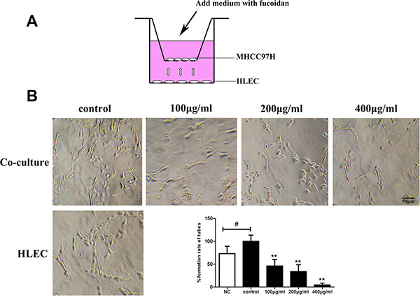 Figure 6: Fucoidan inhibits tumor-induced lymphangiogenesis in vitro. (A) The ideograph of transwell co-culture system. MHCC97H cells and HLECs were cultured in insert wells and lower chambers, respectively. (B) Photomicrographs of tube formation in HLECs and the quantitative analysis shown on the right. NC stands for the negative control which HLECs cultured alone. Mean ± SD is shown; #p < 0.05 versus the NC group and **p < 0.01 versus the co-culture control (one-way ANOVA).