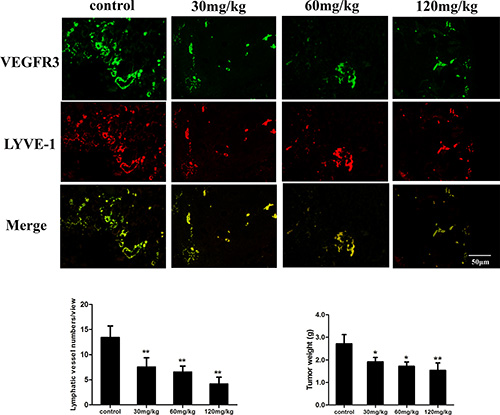 We evaluated the anti-tumor and anti-lymphangiogenesis activity of fucoidan in vivo, whereby mice were inoculated with mouse hepatocellular carcinoma cells with high lymphatic metastatic activity (Hca-F cells). Immunofluorescent double staining was carried out on tumor tissues with VEGFR3 and LYVE-1, which are markers for LECs, and the results demonstrated that the mean micro-LVD of the tumors decreased from 13.4 ± 2.3 to 4.2 ± 1.3 as a result of treatment with fucoidan (120 mg/kg). As shown in Figure 7, the micro-LVD of mice treated with fucoidan was significantly reduced compared with the normal saline control group (p < 0.01). The average weight of tumor of fucoidan-treated mice were also significantly lower (p < 0.05 and p < 0.01) compared to those of the control. Thus, the analyses identified that fucoidan could inhibit tumor growth and lymphangiogenesis in tumor tissue in vivo.