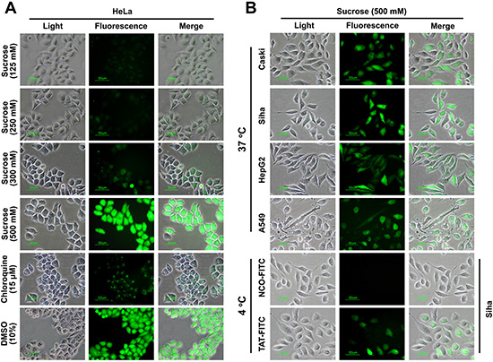 Figure 1: The penetrating efficiency of TAT can be enhanced by suitable concentration of sucrose, glucose as well as manntioll. (A) Intracellular distribution of TAT-FITC detected by fluorescence microscopy. Chloroquine and DMSO treatment were used as control. (B) The subcellular distribution of TAT-FITC in different cell lines incubated with sucrose (500 μM) at 37°C or at 4°C.