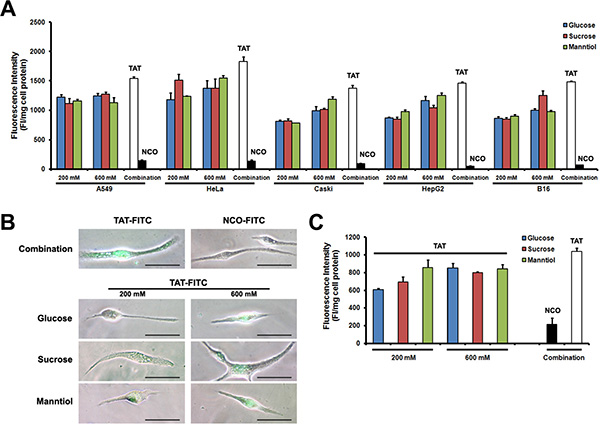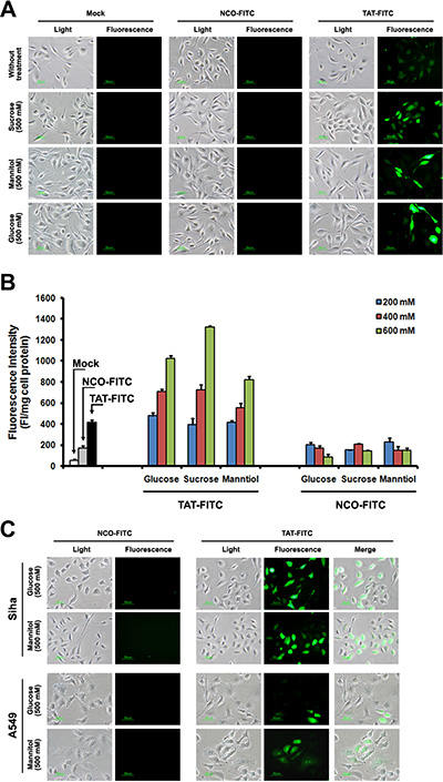 Figure 2: TAT-FITC uptaken by different cells treated with sucrose, glucose and manntiol. (A) Caski cells were incubated with glucose, sucrose and manntiol (500 mM) for 1 h, and then treated with TAT-FITC for 1 h at 37°C. Fluorescence images were observed using fluorescence microscope. (B) Quantitative analysis of FITC-labeled TAT uptaken by Caski cells incubated with different concentration of glucose, sucrose and manntiol. (C) Fluorescence images of TAT-FITC uptaken by A549 and Siha cells incubated with glucose and manntiol.