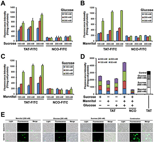 Figure 3: Quantitative analysis of Caski cells showing TAT-FITC penetration enhanced by co-incubation with glucose, sucrose and manntiol. (A) Caski cells were co-incubated with glucose and sucrose (from 100 to 300 mM) for 1 h, and then treated with TAT-FITC for 1 h at 37°C. NCO-FITC group were used as negative control. (B) Caski cells were co-incubated with glucose and manntiol (from 100 to 300 mM) for 1 h, and then treated with TAT-FITC for 1 h at 37°C. (C) Caski cells were co-incubated with sucrose and manntiol (from 100 to 300 mM) for 1 h, and then treated with TAT-FITC for 1 h at 37°C. (D) Caski cells were co-incubated with glucose, sucrose and manntiol (from 50 to 300 mM) for 1 h, and then treated with TAT-FITC for 1 h at 37°C. TAT-FITC group incubated with glucose, sucrose and manntiol (600 mM) separately were used as control.