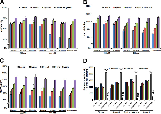 Figure 4: Cell viability of Caski cells rescued by glycerol and glycine combination. (A) Caski cells were incubated glucose, sucrose and manntiol combination or separately as well as supplement with glycerol and glycine for 1 h at 37°C, discarding the supernatant of culture, washed with PBS 3 times, and then cultured for 24 h, cell viability was detected following the MTT protocol. (B) Cell viability was detected after 48 h culture with fresh medium; (C) Cell viability was detected after 72 h culture in fresh medium; (D) Quantitative analysis of FITC-labeled TAT uptaken by Caski cells incubated with glycerol and glycine combination or separately.