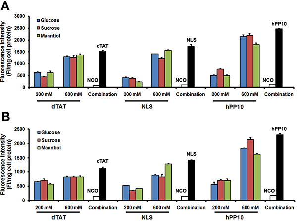 Figure 6: Different FITC-labeled peptides penetration in Caski and HepG2 cells. (A) Quantitative analysis of dTAT-FITC, NLS-FITC and hPP10-FITC in Caski cells co-incubated with glucose, sucrose and manntiol. (B) Quantitative analysis of dTAT-FITC, NLS-FITC and hPP10-FITC in HepG2 cells co-incubated with glucose, sucrose and manntiol.